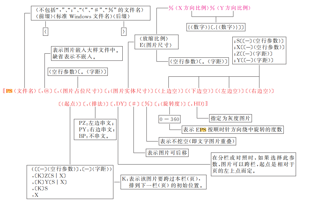 此案例中的SXZY与图片TP注解中上下左右边空所表示含义相同,TP注解中有<排法>说明,以及起点来控制其所在位置,新插XC注解中,是直接将图片插入所在文字旁,只可控制其相对位置,又叫基线位置SQ上齐,XQ下齐,JZ居中;由此可知使用XC注解与TP注解的区别,TP注解对于图片位置的控制更为灵活,TP注解插入的文件格式可为TIF及其他格式,但不可为EPS,插入EPS图片格式有XC注解和PS注解,XC注解插入的文件格式可为TIF或EPS,但XC注解插入EPS记得加入;P参数说明。为了解决XC注解插入EPS格式文件后图片位置不好控制的问题,所以用到了下面的PS注解,与TP注解类似,可更自由的控制EPS图片格式文件的位置。